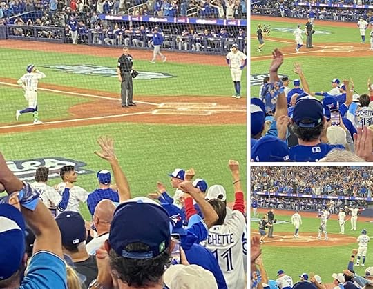 Three shots of Bo Bichette heading for the plate after his three-run homer in the third inning put Toronto up 3–0. Though I hoped we’d score more runs to make the lead a little more comfortable, I really thought the Blue Jays were going to win the World Series at this point…