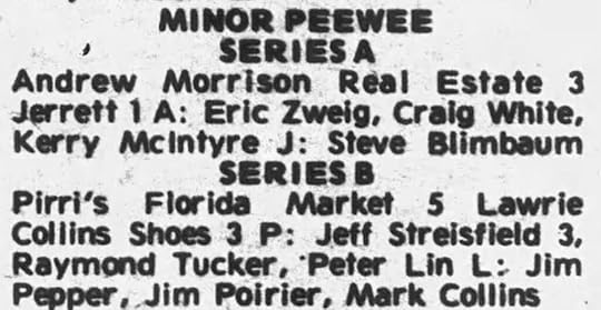 The North York Mirror reported on our house league games!I was a pretty good house league player. A defenceman who liked to rush the puck. (I knew I wasn’t Bobby Orr … but I tried!) Anyway, in December of 1974, I was traded to a weaker team to help prop them up. I remember it as being the night of our family Hanukkah party at our Freedman cousins’ house. Looking it up, I see Hanukkah started on Sunday night, December 8, 1974 … so I bet it was that very night. I remember getting a call from the convener of the league before we left home. He told me the coach of Andrew Morrison Real Estate wanted me for his team. But it was my choice.