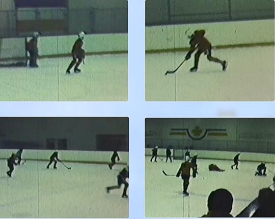 Stills from home movies shot by my father at Bayview Arena in 1975. Top left, patrolling the front of our net. Top right, picking up the puck on my backhand. Bottom left, carrying the puck out of our zone. Bottom right, at the opposing blue line.It turned out, Andrew Morrison was a pretty strong team. We were led on offense by the coach’s son, Kerry McIntyre and Ross Takeuchi. I anchored the defence with Blake Jacobs. Our goalie was Andrew Spitzer; the best in the league. And we went on to win the championship.
