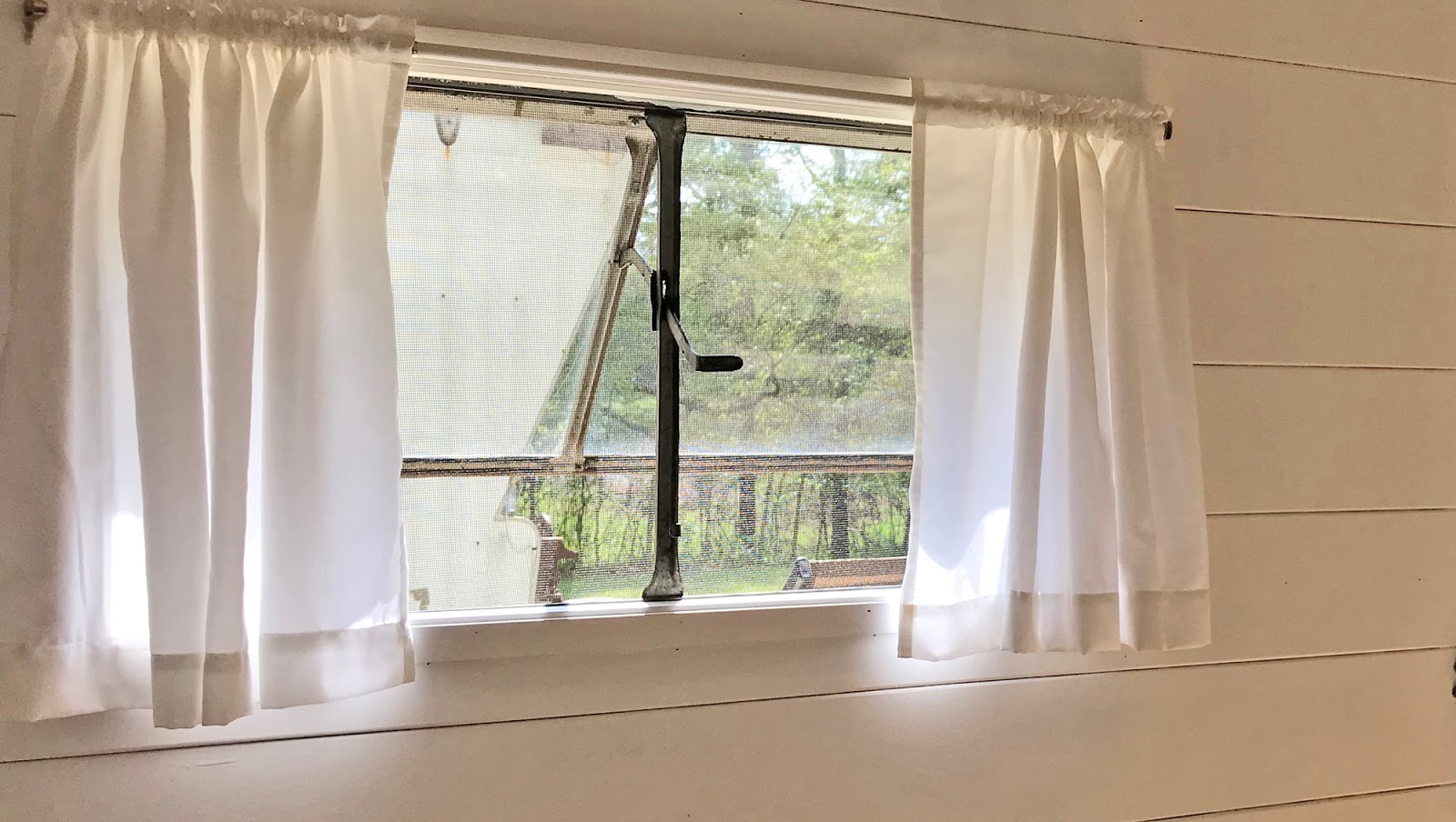Two panels per window. Four little windows. Two long windows at the front and back. A big curtain to pull closed at the napping/changing end of the trailer. Thirteen panels altogether.