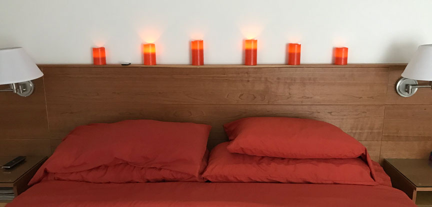 Some months ago (maybe a year, I forget) John built a new headboard for our bed. It has a shelf that’s three inches deep (I measured it). I bought orange bamboo sheets in Wisconsin, and my daughter Sue gave us her orange electric candles. At night it glows.