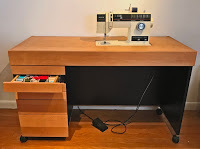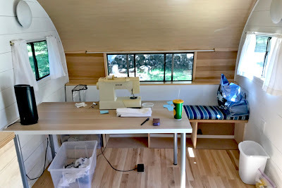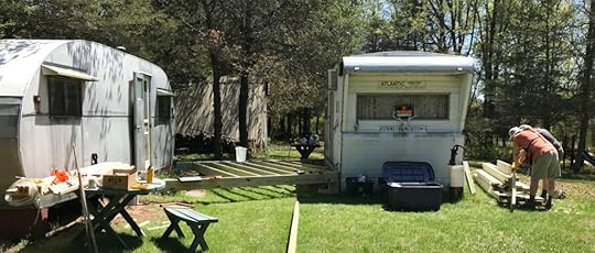Last week, while I was in the trailer sewing, the Bogner brothers built a deck between the old trailer (1949 Nassau—the writing trailer), and the new contractors trailer (1969 there abouts). The place was buzzing with activity—saws, nail guns, and sewing machine.