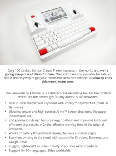 Writers: Want an awesome free way to write on the go that is 100% awesome and distraction-free? Enter to win a limited edition Freewrite from Astrohaus now! Click here: https://wn.nr/AwWPkD
