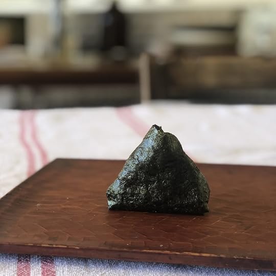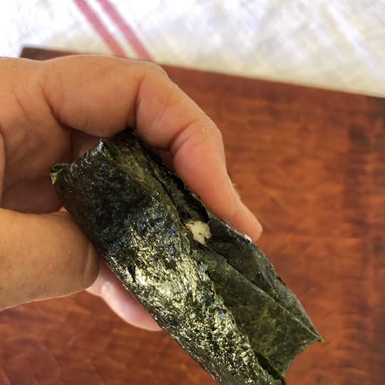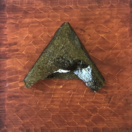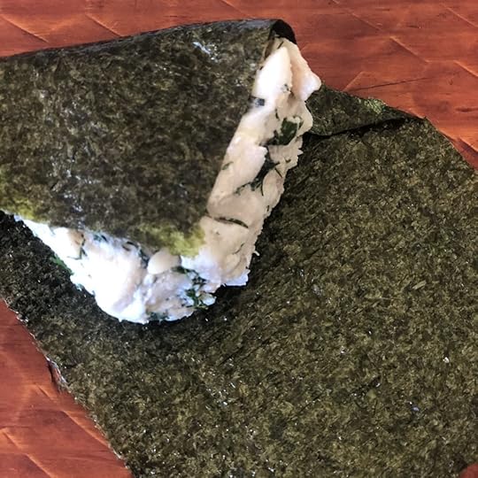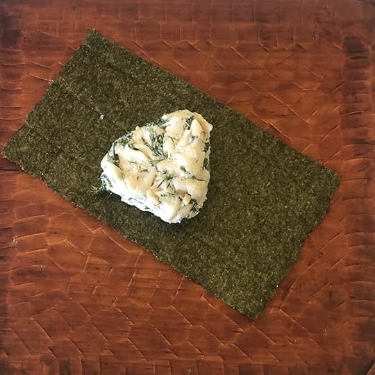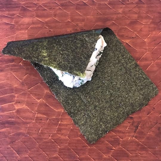 Spread half of the mix on a sheet of nori and roll up or form the fish in to triangles and wrap in half a sheet of nori, to make O’musubi, place half a sheet of toasted nori smooth side down with horizontal lines, see images below for how to wrap. Wrap the triangle as you would a gift and if possible, eat while the nori is still crisp.