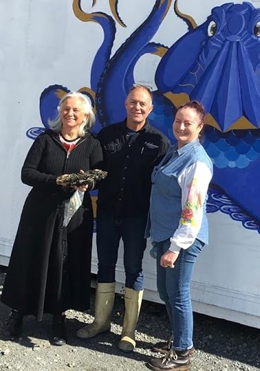 Thanks to Jo our whirlwind 3 day tour included meeting James Ashworth for a fabulously enlightening discussion about the fishing industry and local species, seasonality, seaweed harvesting and the Roaring Forties superb octopus. We ate splendid pies at The Woodfired Bakehouse in Cygnet and discussed bread and fire with Liam who was delighted to show us their fabulous woodfired oven. Then at my special request, we had a meet up, in her delightful home, with food stylist and chef Michelle Crawford, below right, seen in her garden. I have been an instagram follower and admirer of Michelle’s for some years and it was a total delight to sit with tea at her table and wander her wild and wonderful garden. A rose never smelt so sweet. I hope to return there one day soon. Dinner and funky wines at Der Makr’s wine bar Lucinda was a treat one evening, as was breakfast at the Pigeon Hole Bakery. Lunch at The Agrarian Kitchen was a highlight and then a tour of Rodney’s beautiful home, school and gardens, he is seen below with a giant apple from his overladen tree. Fermenter @roughrice, Adam James, was teaching at the Agrarian kitchen school that day, it was so good to meet him; another mad fermenter, he may kindly make some of what we need for our dish.