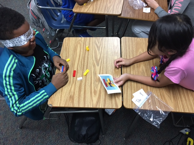 When students came into class I split them into pairs. I gave one student a blindfold and the necessary bricks for their assigned structure. The other partner received the picture directions.