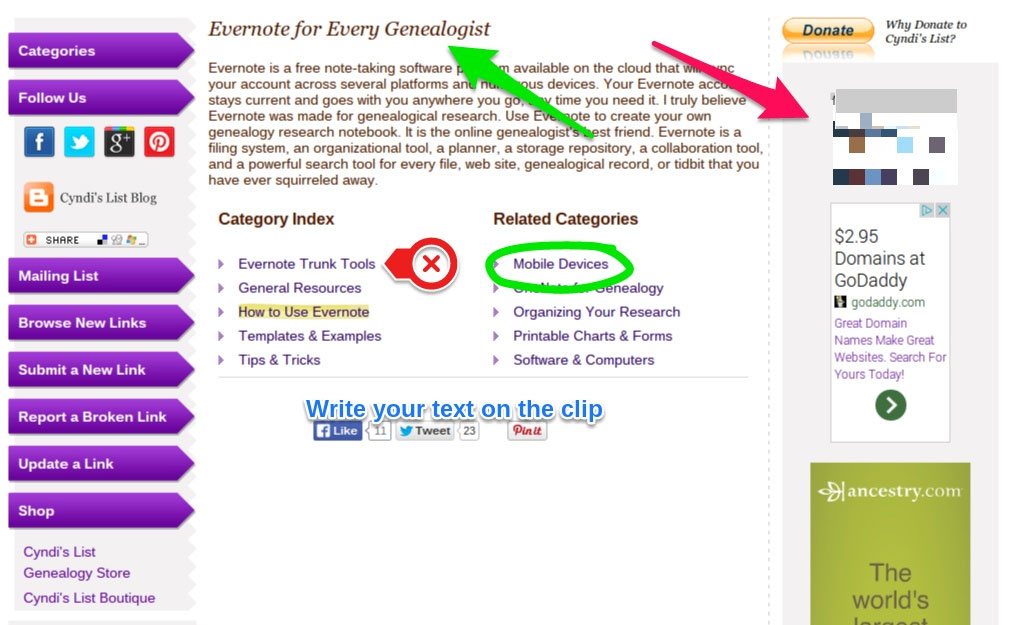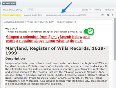 For genealogy the webclipper means clipping a source for your research. As you research online you will run across bits of text, entire articles, images of records, or web sites that you might want to bookmark and revisit. Clip these things into the appropriate notebook in Evernote and you can refer to them any time you need to, from any of your devices with Evernote installed. As you clip Evernote automatically tracks the date you made the clip, the last date you modified the clip, and the original URL from which you obtained the clip.