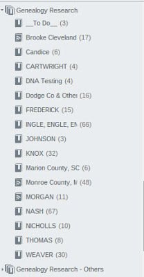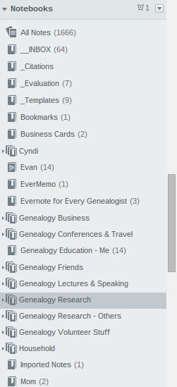 You can have up to 250 notebooks within Evernote. Notebooks can be stacked one level deep under a top level. So, my personal set-up has a stack for Genealogy Research and under that I have one notebook for each surname I work on and one notebook for some of those localities in which I am doing a lot of research on several families.