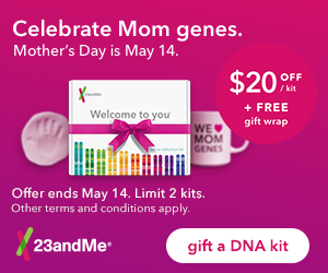 This Mother's Day, celebrate her DNA story. Order DNA test kits today at 23andme.com. Save $20. Hurry, offer ends May 14!