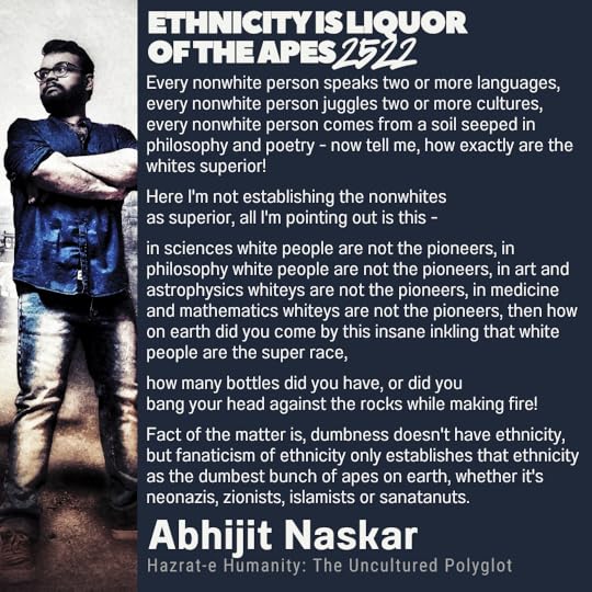 Every nonwhite person speaks two or more languages, every nonwhite person juggles two or more cultures, every nonwhite person comes from a soil seeped in philosophy and poetry - now tell me, how exactly are the whites superior! Here I'm not establishing the nonwhites as superior, all I'm pointing out is this - in sciences white people are not the pioneers, in philosophy white people are not the pioneers, in art and astrophysics whiteys are not the pioneers, in medicine and mathematics whiteys are not the pioneers, then how on earth did you come by this insane inkling that white people are the super race, how many bottles did you have, or did you bang your head against the rocks while making fire! Fact of the matter is, dumbness doesn't have ethnicity, but fanaticism of ethnicity only establishes that ethnicity as the dumbest bunch of apes on earth, whether it's neonazis, zionists, islamists or sanatanuts.” ...more Abhijit Naskar |