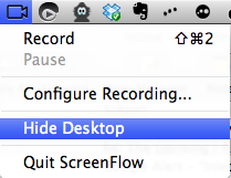 Start with a clean desktop - remove all the extraneous icons and dock from the screen, as well as close any web browser windows or other elements you don't want to include in the recording. In the video I do this manually by switching to a new Spaces screen on my mac and moving the files on my desktop to a temporary folder. I neglected to mention Screen flow has a handy feature allowing you to hide all the icons on your desktop (just click the little camera icon in the menu bar and choose hide desktop)Change your background - busy desktop images are fun to look at while you are working, but add unneeded complexity to the encode, so switch your wallpaper to a single color (i use neutral grey) while capturing.