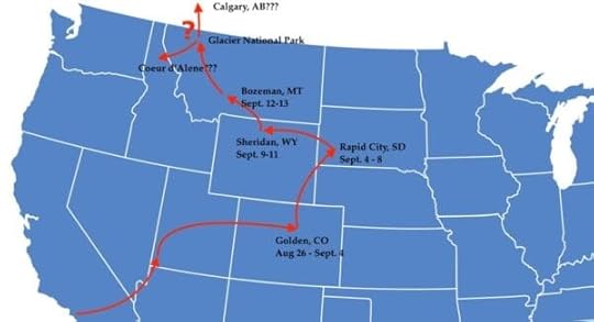 August 25 — September 4, Denver, ColoradoSeptember 5 — 7, Rapid City, SDSeptember 9 — 11, Sheridan, WYSeptember 12 — 13, Bozeman, MTSeptember 14 — 18, Glacier National ParkSeptember 19 — 21, Calgary, ABSeptember 26 — 27, Coeur d’Alene, IDFrom there, we’ll choose a route home, most likely taking us into Washington and Oregon. We’ll see where the wind of the Spirit blows us.