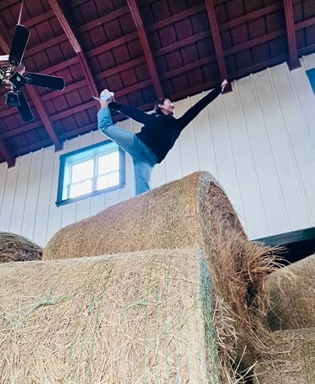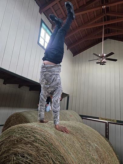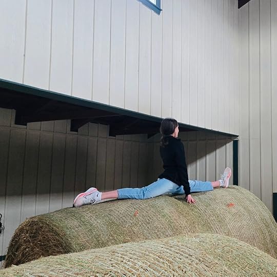 I feel confident that gymnastics hs never been performed previously at Medicine Spirit Ranch, especially atop the stack of round bales residing in the hay barn.