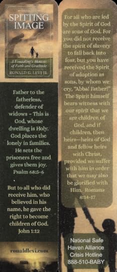 I created bookmarks to complement the cover art of Spitting Image and I'm very pleased with how the finished product turned out. The premium ice pearl stock is printed on the front with the cover of my Spitting Image and features two inspirational scriptures chosen prayerfully and personally to bless those who have adopted children, have been adopted themselves, foundlings, parents, families and anyone searching for truth.