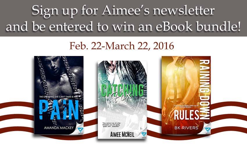 If you sign up between now and March 22 you will be entered to win 1 of 2 eBook bundles!Pain by Amanda MackeyCatching Fox by myself, Aimee McNeiland Raining Down Rules by BK Rivers