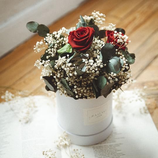 – Bouquet flores. Es un detalle para siempre, con flores cultivadas en su mejor momento para poder preservarlas. Con paniculata, eucalipto y rosas rojas en una caja con nuestra palabra favorita del mundo »¿bailas?».