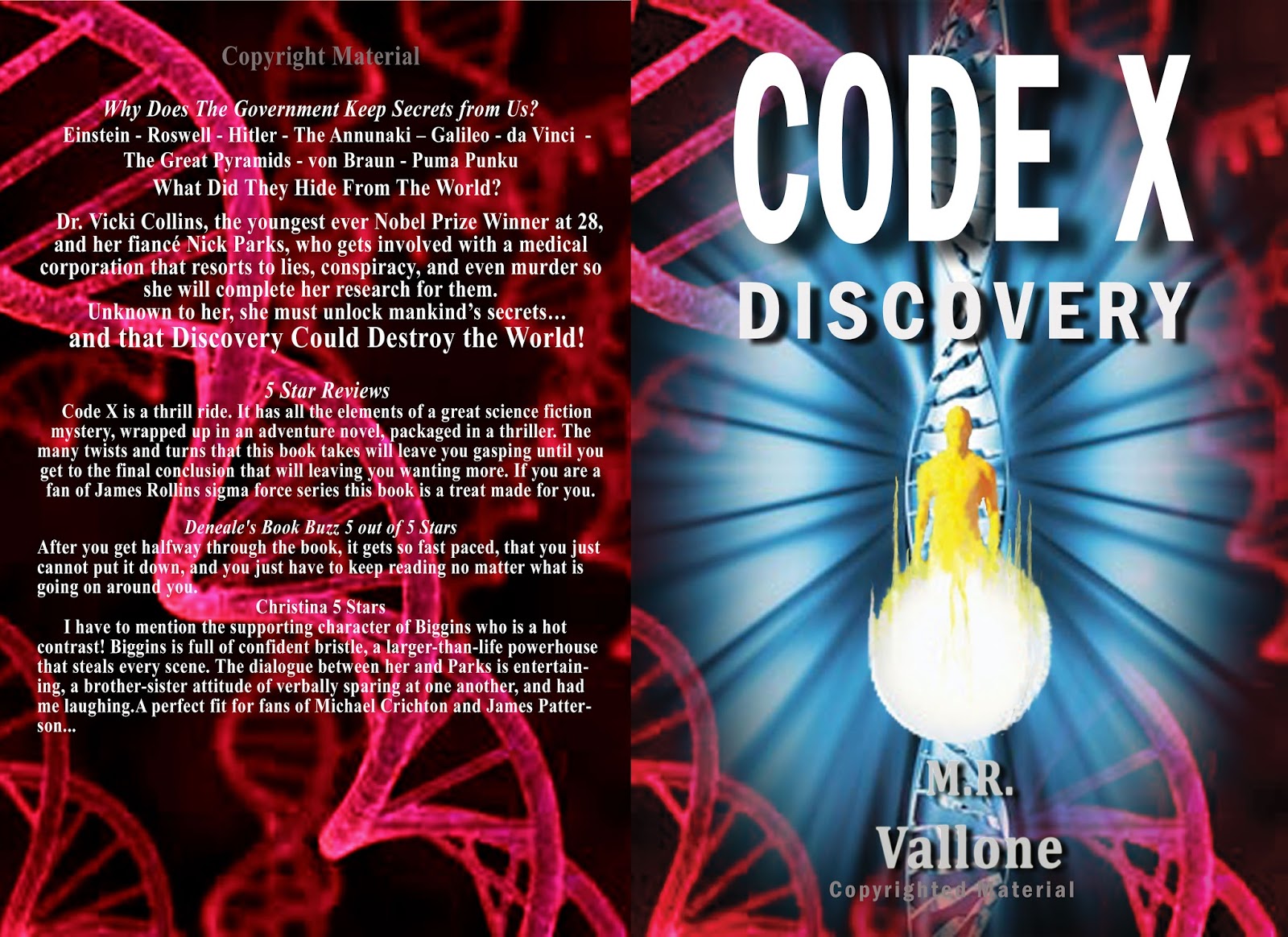 Why Is There Only One Einstein Every 100 Years?What Event Let Humans Make The Great Leap Forward 5,000 Years Ago?GEORGE WASHINGTON LED EVERY BATTLE IN FRONT OF HIS TROOPS-THE SAME THING ALEXANDER THE GREAT DID-BUT WAS NEVER HIT BY A BULLET. HOW IS THAT POSSIBLE FOR AN ORDINARY MAN?Overall, it is one of the best books I have ever read in years. Code X has everything, Science Fiction based on facts now and in the future, love and romance, an action adventure with twists and turns every moment, a mystery, female lead characters who are real and then a trip into the unknown. Fans of James Patterson and Michael Crichton will like the easy to understand explanations of science that doesn’t bog you down, but the author, M.R. Vallone made it fun and easy to understand. Code X is for everyone and I predict a star, Michael Vallone, has been born in the author heavens. Can’t wait for more from him. Excellent book.