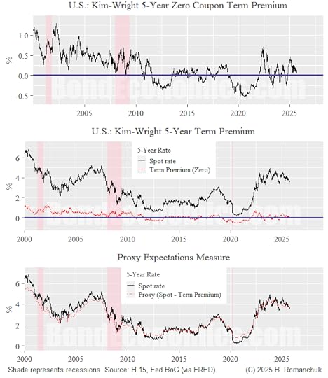 I have been looking at term premium models as part of a non-writing project. I decided to take a look at the Kim & Wright model output (available via the Federal Reserve, paper link: http://www.federalreserve.gov/pubs/feds/2005/200533/200533abs.html). By way of background, there are two very popular term premium models, the Kim & Wright paper, and the one by Adrian, Crump, and Moench (ACM).