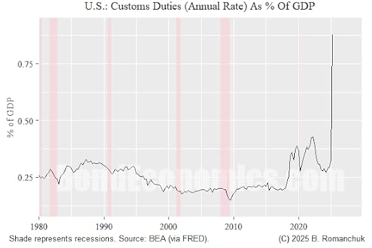 The customs duties data for the United States was recently updated, and we can assess the “success” of Trump 2.0’s tariff policies so far. On an annualised run rate, customs duties were 0.88% of GDP in the second quarter (the latest monthly figure Treasury I saw was around $350 billion annualised versus the $267 billion BEA second quarter figure).