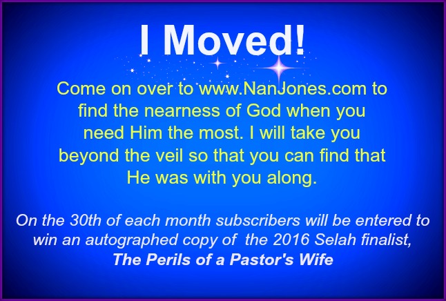 I'm so happy you've stopped by Morning Glory. I want to inform my visitors that I HAVE MOVED to my new website and blog at www.NanJones.com. I'm so excited and so thankful for the Lord's goodness. Please take a moment to come on over and check out my new home. I look forward to helping you find the nearness of God when you need Him the most.