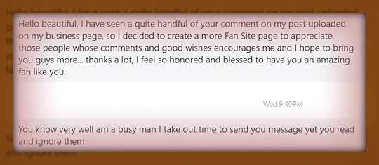 However, this time, I was curious—and I thought, hmm, this might make for an interesting post—so I followed back. And lo and behold, a message arrived a day later, as I suspected one would. “Hello beautiful” it began. Ooooh, Fake Rock Star has a discerning eye . Evidently, he’s decided to start an official fan site to address those who comment frequently and offer good wishes on the other [real] fan site.