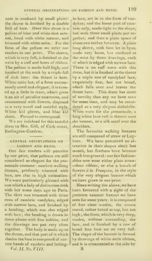 • Morning dresses, with their triple fall of work at the wrist, “have, at a distance, an uncommonly ludicrous effect; the trimming being pointed, and worked in holes, has the appearance, specially when there are so many falls of it, of being actually in rags.” Ah, what the élégantes will wear, all in the name of fashion!