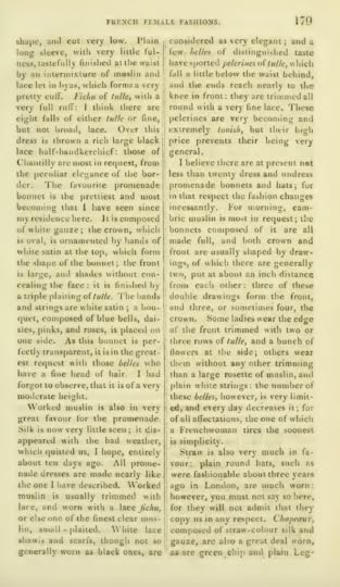 “for example, you see a bonnet lined with blue, trimmed with green, and perhaps ornamented with a bunch of different coloured flowers; at present, blue, rose-colour, and green are favourite linings; but, I think, plaid silk is still more than any thing in request, and some of our most distinguished fashionables have sported bonnets entirely composed of it” (180).