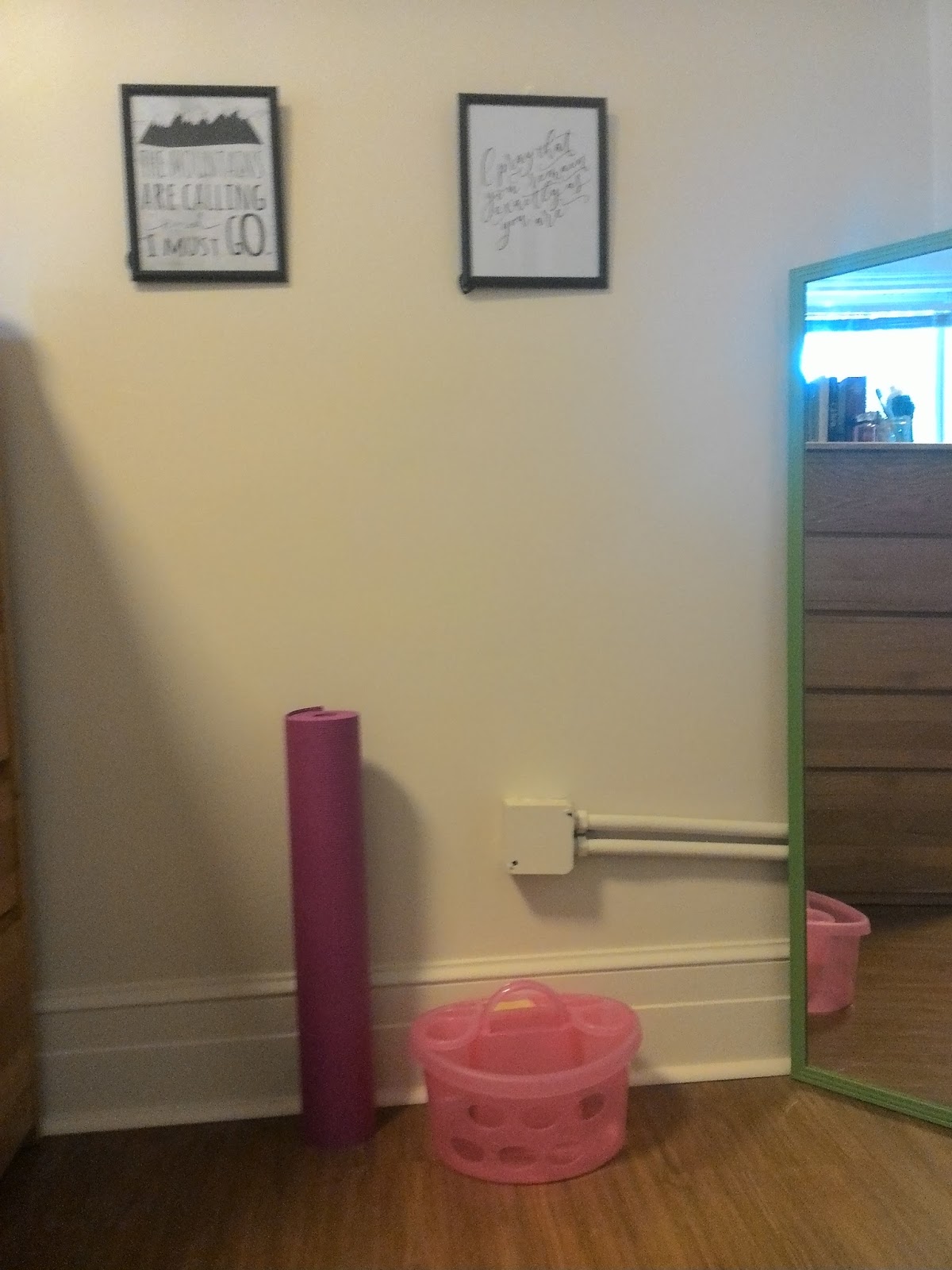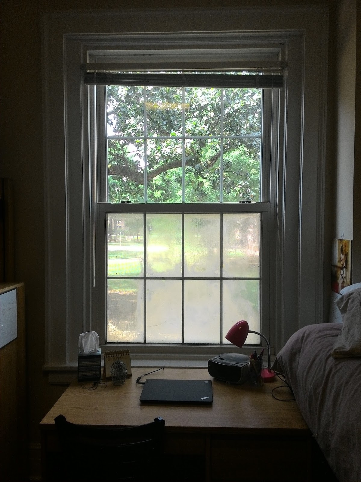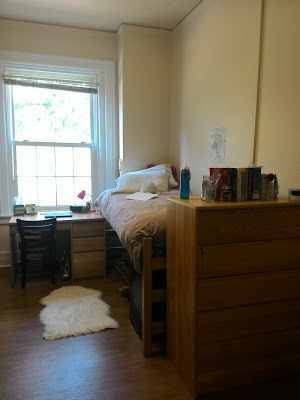Before I say anything else, I have to fangirl a little about my dorm.  It has crown molding.  And beautiful real floors, and beautiful yellow walls, and a gigantic window looking out on the oak tree-lined quad.  I.  Love.  My.  Dorm.