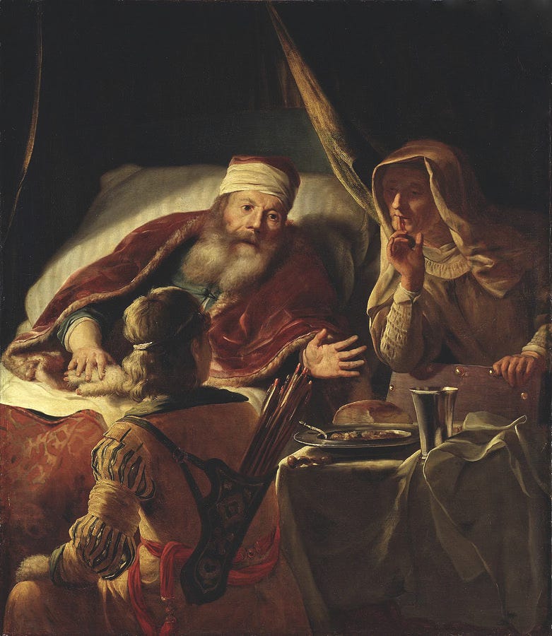 But one detail that always stands out to me in this moment—a detail that van Djick’s painting handles very subtly—is the detail of Rebekah putting Esau’s clothes and goatskin on Jacob. It’s clear when you look for it—the quiver of arrows on his back and the furry hand being touched by Isaac. It’s the clearest picture of the deceit—Jacob is literally wearing a disguise to hide the fact that he is a fraud.