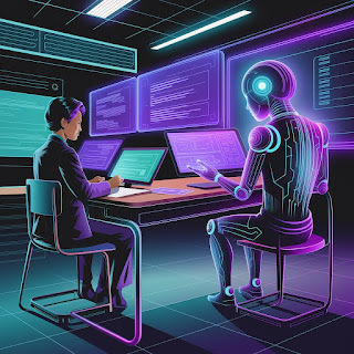 Ideogram: A synthwave-inspired illustration depicting an AI and a teacher collaboratively grading papers.
