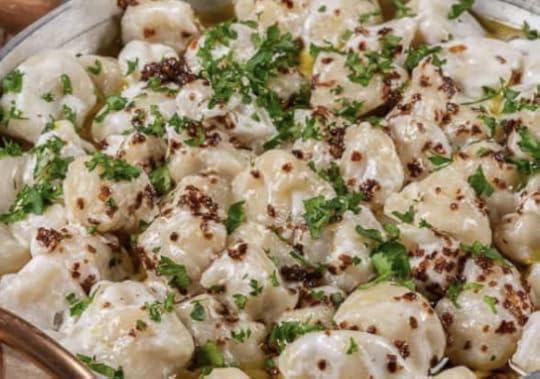Turkish manti can most easily be described as tortellini filled with meat and presented with a creamy buttery garlic yogurt sauce on top, but the kind I had was made like that, and then “soupefied” (it’s my word, I created it!) with some of the pasta water. The ones I see photos of on the web have missed this (IMHO) crucial step. I once had a little group of Turkish graduate students I’d become friends with, and they took me to a restaurant in NYC that served manti, which they said is normally a food not served in restaurants, because “Only Mama makes it.” And then they had Mama send some, somehow, frozen like a brick, and they made it for me at home too. I don’t eat a lot of meat these days, but if someone put a steaming bowl of manti in front of me, especially if it was soupefied, it would be impossible to say no.