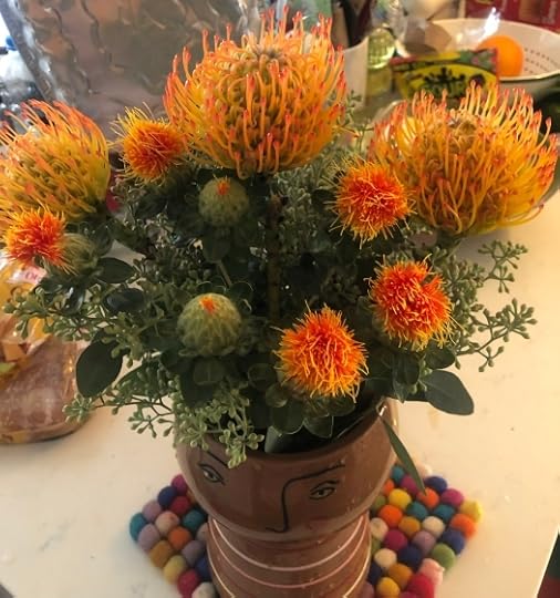 Today my beautiful lady head is holding pincushion protea, safflower, and eucalyptus. When I was younger I was more snooty about flowers: they had to smell, and smell good. None of these really have a smell, although fresh (really fresh) eucalyptus can smell wonderful. Cost for flowers, again about $11 at Trader Joe’s.