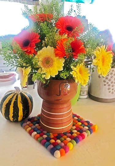 The little pumpkin/squash you see there I plan to eat, not carve. LOL. Roasted pumpkin in things is divine! As are these lovely gerbera. Ranunculus are actually not great cut flowers, so droopy.