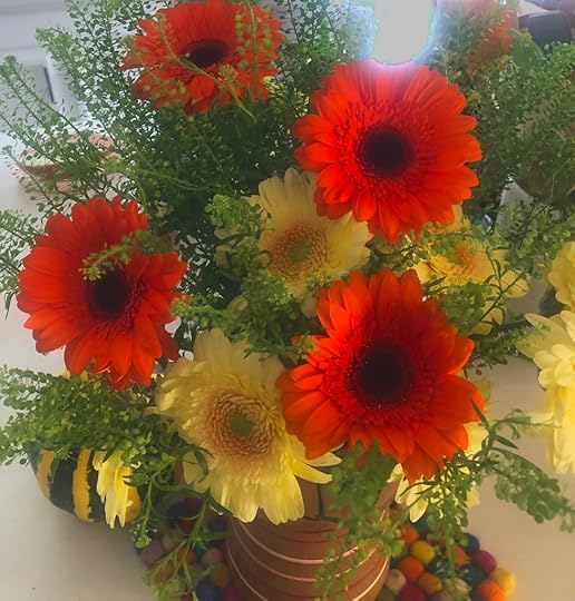 In any case, I do have to say I’m not usually a gerbera girl, except when needs must. But today the yellow (which is a lot lighter in real life) on the flowers screamed, “Butter!” at me, with just a hint of orange at their centers, and so I was compelled. Mixed them with orange and some green greenery, et voila!