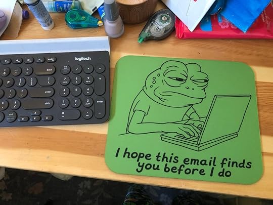 LOL, no just kidding. That’s an old lady joke. It was my mouse pad. And it was disgusting. It was black, said “But First Coffee,” and had started to become one with the desk.