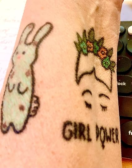 Sophie drew the mint chocolate chip rabbit. Girl power I created from various clip arts. That one was my first, done in DE. I got it when Hillary Clinton lost to the monster. The idea was that if I held up my arm in a fist, the patriarchy could see it when I helped to smash it. The guy who tattooed me said he wasn’t sure what the patriarchy was, but he thought the placement was correct for smashing it.