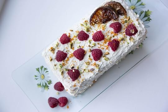 Garnish with halved raspberries, Meyer lemon zest, and roughly chopped pistachios. I candied a few lemon slices at the last minute; they really aren’t critical but they add a little something if you have the time to spare.