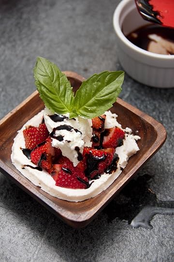 12 or 13 basil leaves submerged in a half cup of heavy cream, brought to a simmer, and then left to infuse for thirty minutes or so at room temp made a perfect base for the freshest, most herbaceous whipped cream to come out of my kitchen. I made a quick balsamic reduction, and then the rest was in the assembly.