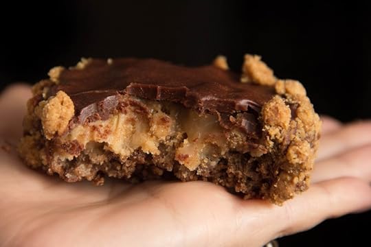 Once the layers were stacked (Cocoa Pebbles crust, salted caramel, peanut butter-cream cheese and crumble filling, salted caramel, cookie dough crumble), I chopped up a Ghirardelli bittersweet bar for a drizzle-worthy chocolate-peanut butter ganache.