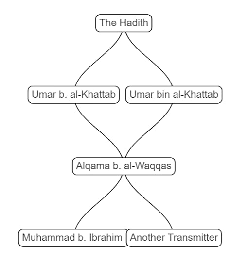 But there is no need to worry too much about getting spellings wrong, because the diagram will immediately make it obvious by making the transmitter show up twice (below we have erroneously spelled Umar b. al-Khattab’s name differently on different chains):