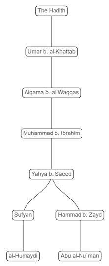 Umar b. al-Khattab > Alqama b. al-Waqqas > Muhammad b. Ibrahim > Yahya b. Saeed > Sufyan > al-Humaydi