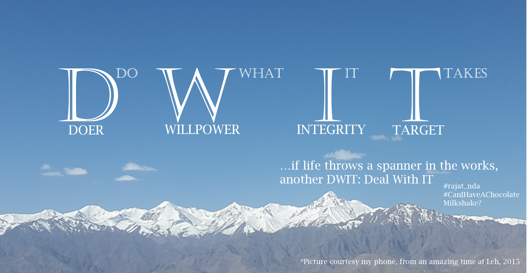 T stands for understanding your targetor objective (know thy enemy, maybe). Many times, we end up pursuing certain line of actions without a clear vision of the end goal. Has that ever happened to you? Of course it has, and that’s fine but not always. If something is really so important that you need to DWIT, then understand your objective and its consequences. Is it worth it? At what cost? And, of course there are many other defining questions.