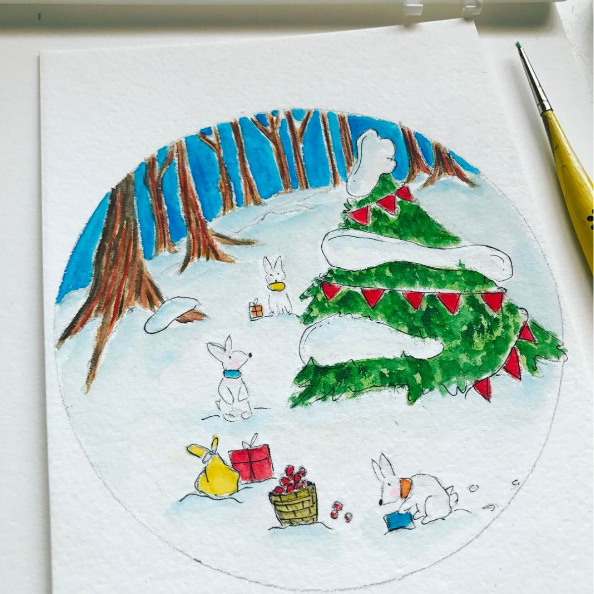 With Michael's birthday trip being this past week, not much work was done in the studio. Which, to me, was fine knowing I need that occasional break due to my head injury. Some days I'm feeling so great, I get carried away with my work forgetting I must take breaks. Otherwise, I'm down several days in a row with intense head pain and eyes hurting, from hitting my head multiple times in my previous car accident. It's frustrating but a part of life I've learned to adjust to.Above is a sketch I doodled out this past week while staying in the mountains for a few days. I'm sharing with you the finished illustration and a photo of it being painted. I must admit, I'm falling in love with painting woodland illustrations of sorts. What do you think? To me, I feel I've found my "calling" within my work.