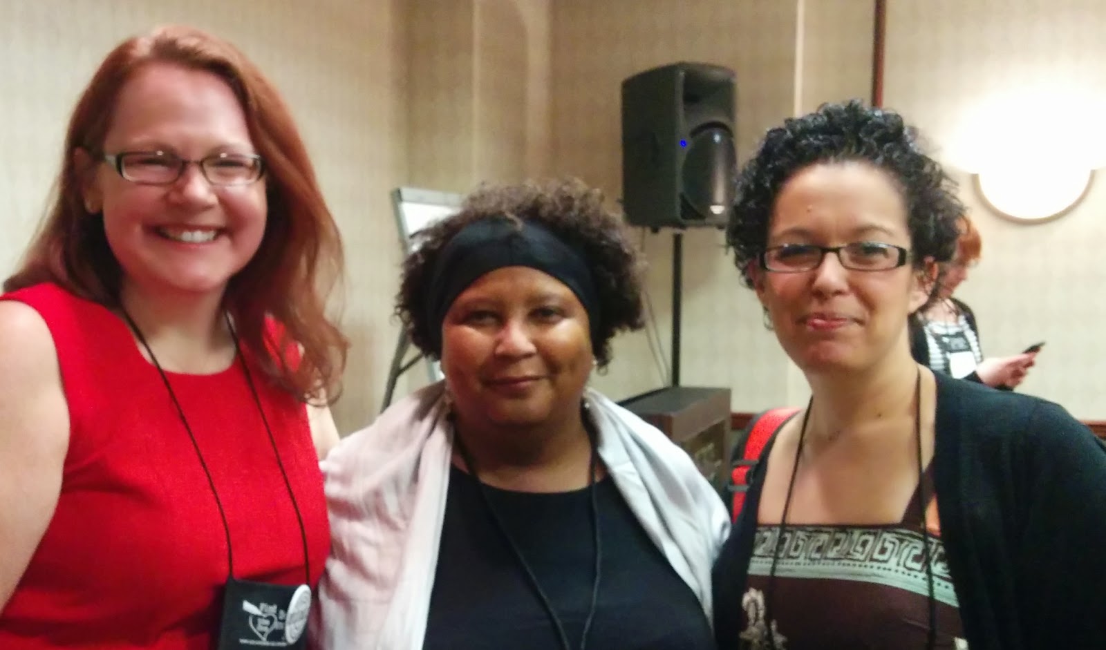 Lauren Dane, Me, Lorelie BrownWe were also joined by Lorelie Brown who showed me an ARC of Riding the Wave, the first book in her Pacific Blue series due out in July. Lauren Dane gave us a sneak peek of the cover for her 2nd Hurley Boys book Broken Open, due out in November, which gives me time to read the first book. Later, Courtney Milan came by with bookmarks featuring her beautiful book covers, she is a interesting lady with a sharp sense of humor, if you get a chance to meet her, ask her about her author survival instructions for Goodreads. Finally, B.A. Binns, YA author and speaker, chatted with me about African - American male characters, or perceived lack thereof in books today.