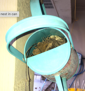 I also watched in wonder as two birds flew back and forth, carrying twigs in their beaks to build a nest in my watering that hung on a post.