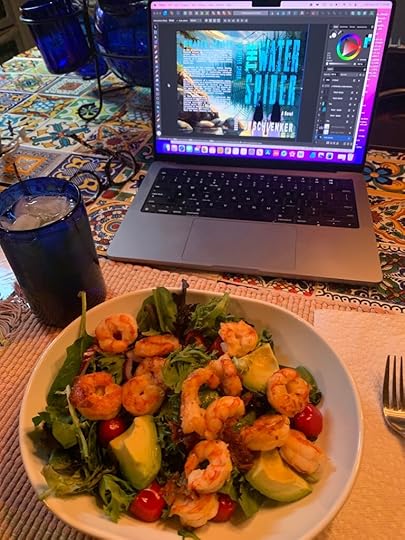 While working on writing, specifically a new cover for The Water Spider, I’m having lunch. This shrimp salad was actually inspired by airport food (Houston—specifically, a Tex-Mex eatery located in Terminal C, although I don’t recall the restaurant’s name). The drink is iced tea.