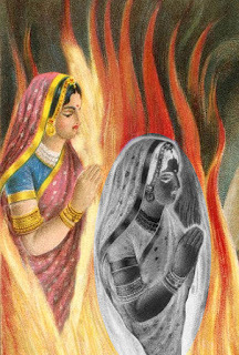 “Step into the fire,” Rama said to his wife, having kindled a great blaze. It was evening, and they had been living in the forest for several years, a simple life punctuated, for Rama and Lakshmana, by battles with rakshasas who were tormenting the sages living in hermitages deep in the forest, away from settled lands. Rama had sent Lakshmana off to hunt, and took this opportunity to engage an important step in his lila. “You will reside in the fire until it is time for you to return to me.” Divine Sita, ever-obedient wife, walked into the bonfire without hesitation. The flames were cool and soothing and folded her into their flickering embrace. Sita walked in and remained, but her shadow walked out and stood demurely before Rama. Sita's shadow was exactly the same as Sita in all aspects – beauty, grace, memories, even in her divine power. “None will know,” Rama said as he stared appreciatively at the shadow-Sita, “of this great deception. Everyone, even the demon-king of Lanka, will believe you are Sita, and he will take you back to his kingdom while my Sita remains in the fire, safe and inviolate. A great conflict will ensue, and all the world will witness and praise my honor and glory.” He continued to stare at shadow-Sita, for not even he with all his divine power could discern any difference between Sita and her shadow. Then Lakshmana returned, and as he and Rama set to skinning and butchering the deer he had caught, shadow-Sita did exactly as Sita would have done and began preparing the rest of their evening meal.