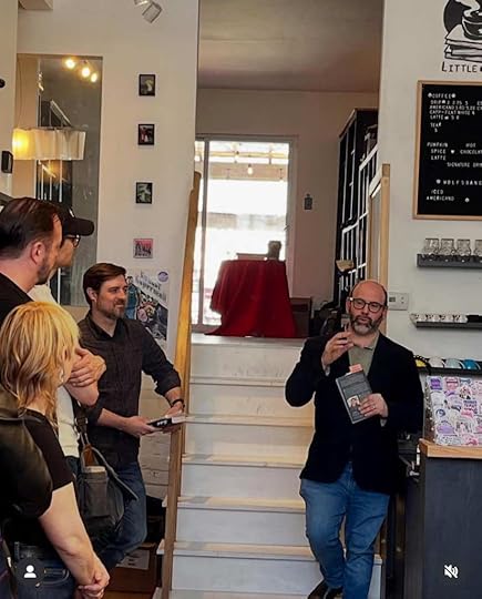 Thing Two: I had the awesome pleasure this past weekend of interviewing Mark Sampson and emceeing the launch celebration for his new horror novel, Lowfield, at Little Ghosts Books. It’s a terrifying page turner, but also a firmly grounded and human story of trying to bounce back from trauma while confronting forces larger than oneself. I absolutely loved it. Big thanks to Mark for having me out, and to the many friends and fine Toronto writers who joined. Launch day coincided with the first sunny patio day of 2025, and we joyfully took our camaraderie to College Street afterward.