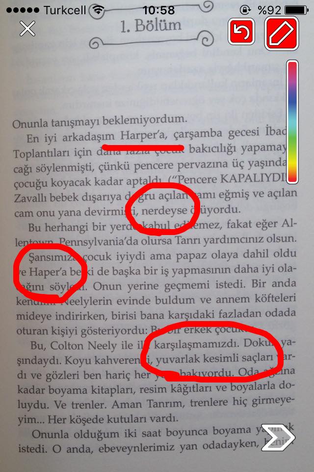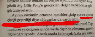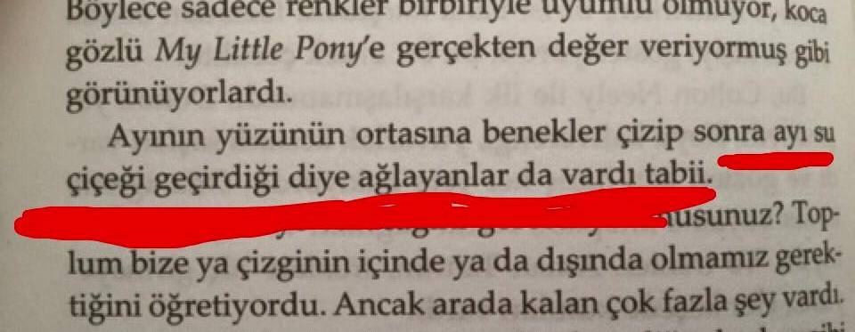 Son olarak: Kitabın çevirisi kötüydü. Kimsenin emeğine ayıla bayıla "ayyy bu kötü" demem zaten ama bana kitabı elimden bıraktıracak kadar hatalıydı. Yazım yanlışları, çeviri hataları, eksik çeviri, orjinal dildekine göre anlam kayması olan cümleler, Türkçe cümle yapısındaki dizilime uygun olmayan cümlelerle doluydu. 30. sayfada pes edip orjinal dile geçtim. Kapağın dokusu ve iç tasarım harika ancak bu edisyon redaksiyon ve çeviri hatalarından ötürü sınıfta kaldı. Benim takıntılı ve kötü düşünceli bir pislik olabileceğimi, bu yüzden böyle laflar ettiğimi düşünecek olanlar için kitaptan altını çizdiğim hatalı yerleri buraya da koyuyorum.