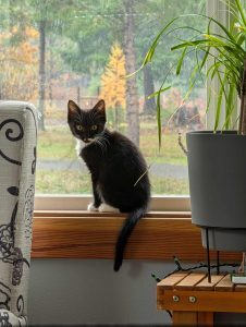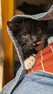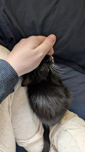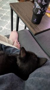 My kitten enjoying a cozy day with me.